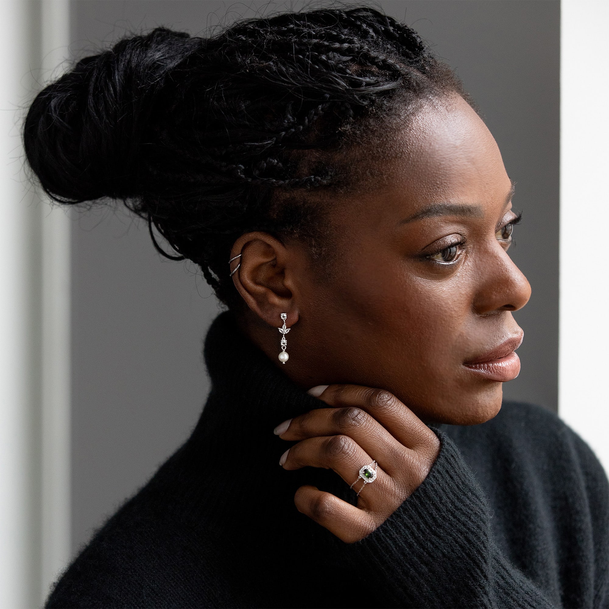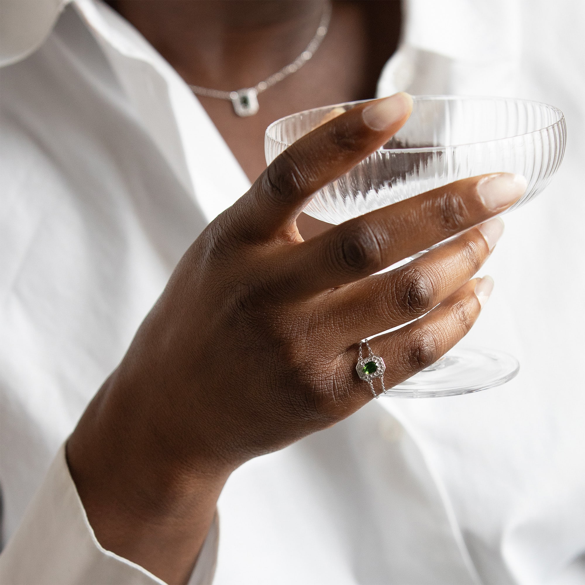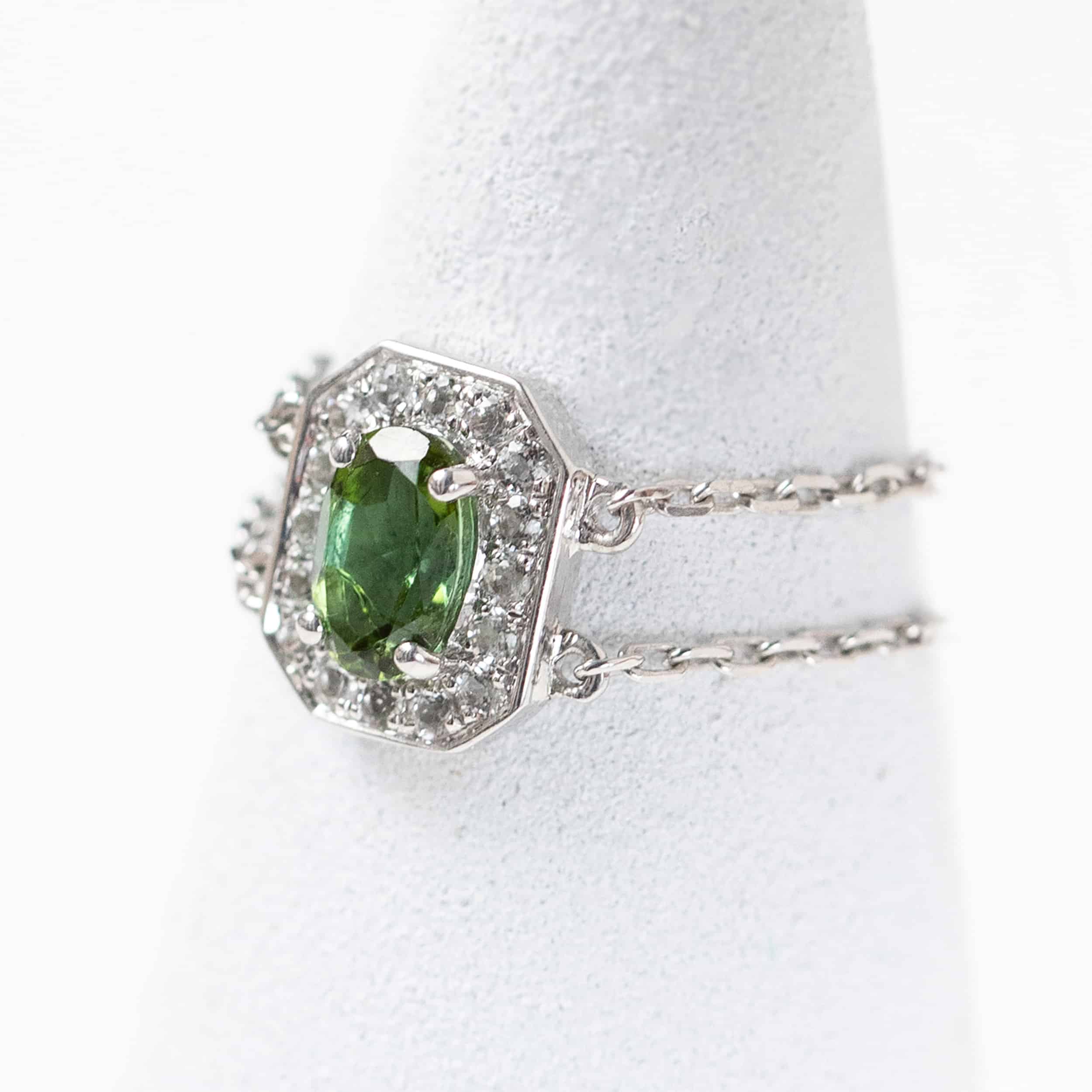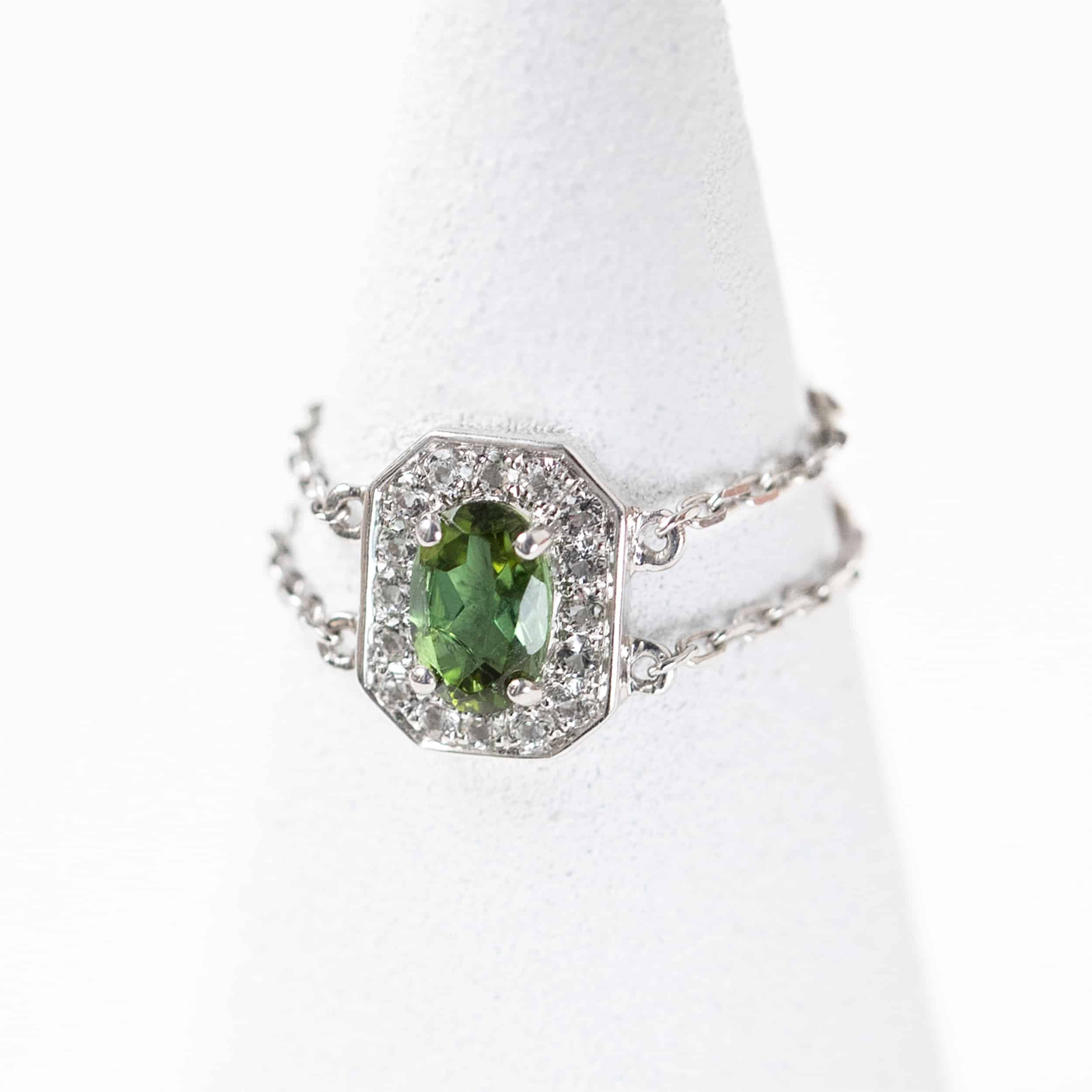 Bague chaîne sertie d'une tourmaline verte véritable et naturelle taille ovale et de topazes blanches véritables taille brillant. Ce bijou est en argent massif 925/1000e (métal précieux).