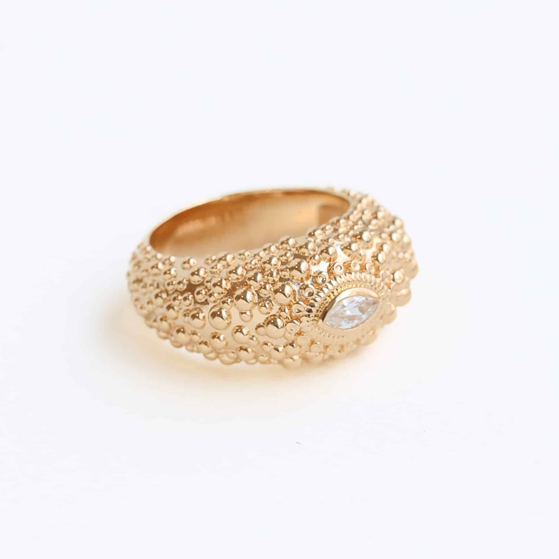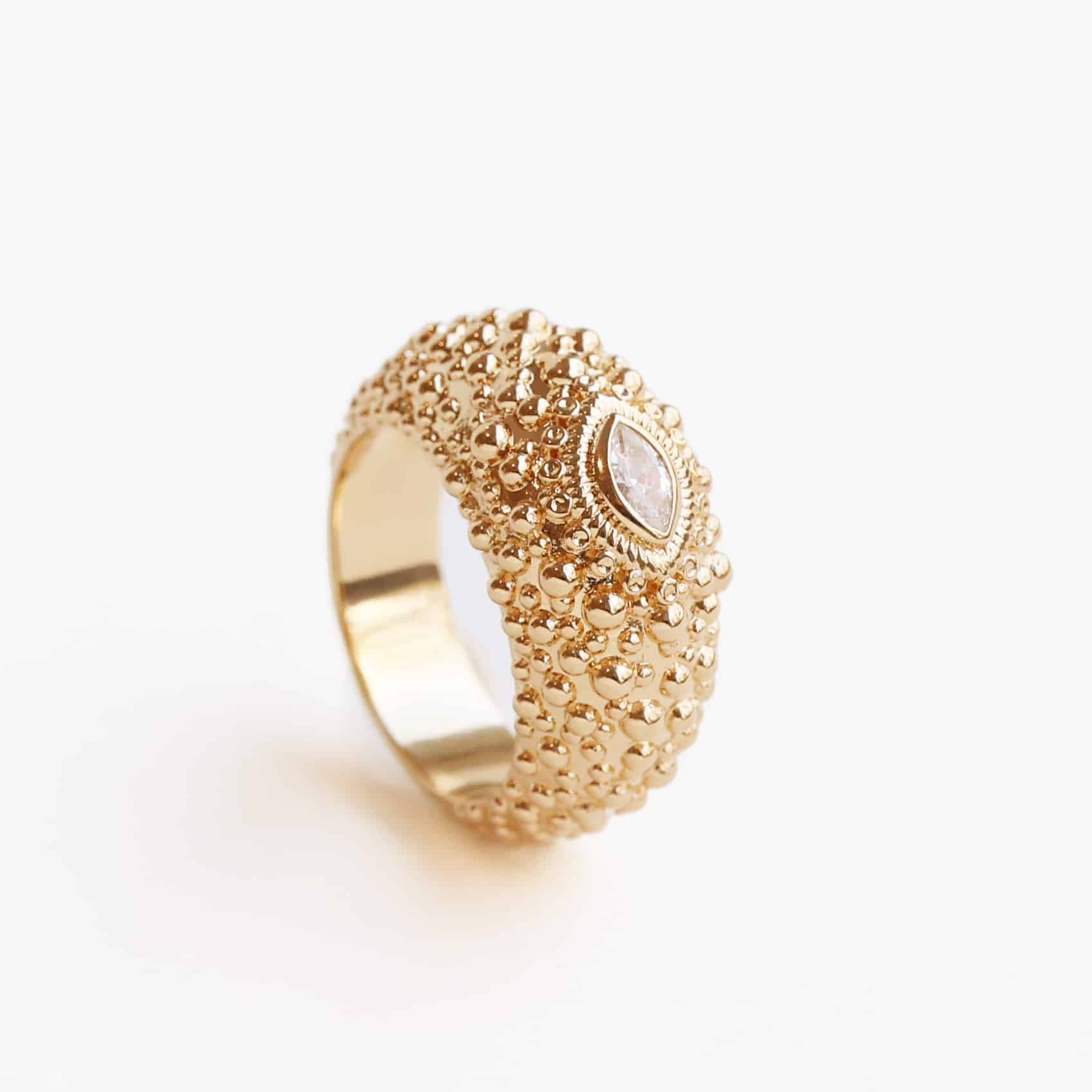 Bague texturée ornée d'un cristal CZ* taille marquise en plaqué or 18 carats, 3 microns.