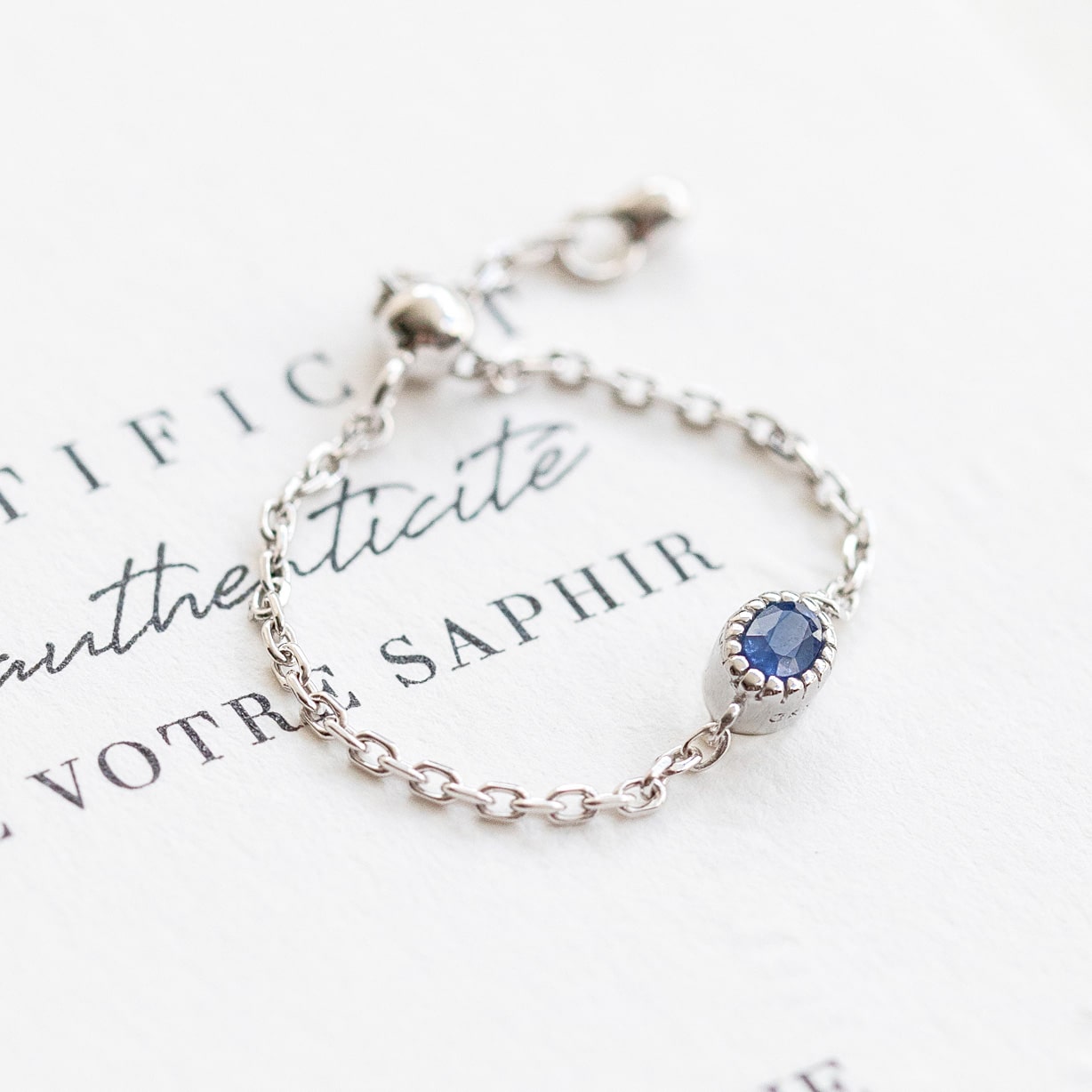 Bague chaîne en argent sertie d’un saphir véritable et certifié, taille ovale, orné d'un décor perlé. Ce bijou est en argent rhodié 925/1000e (métal précieux).