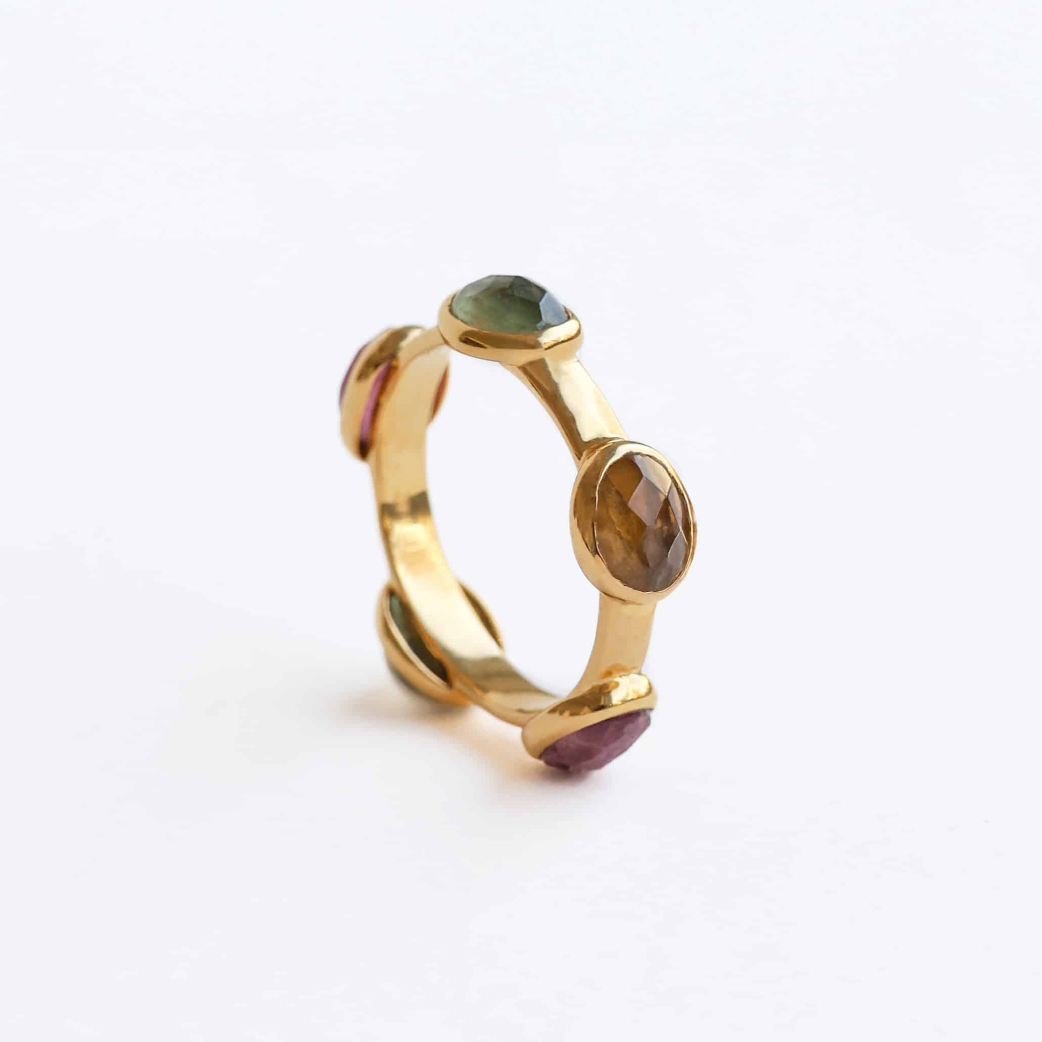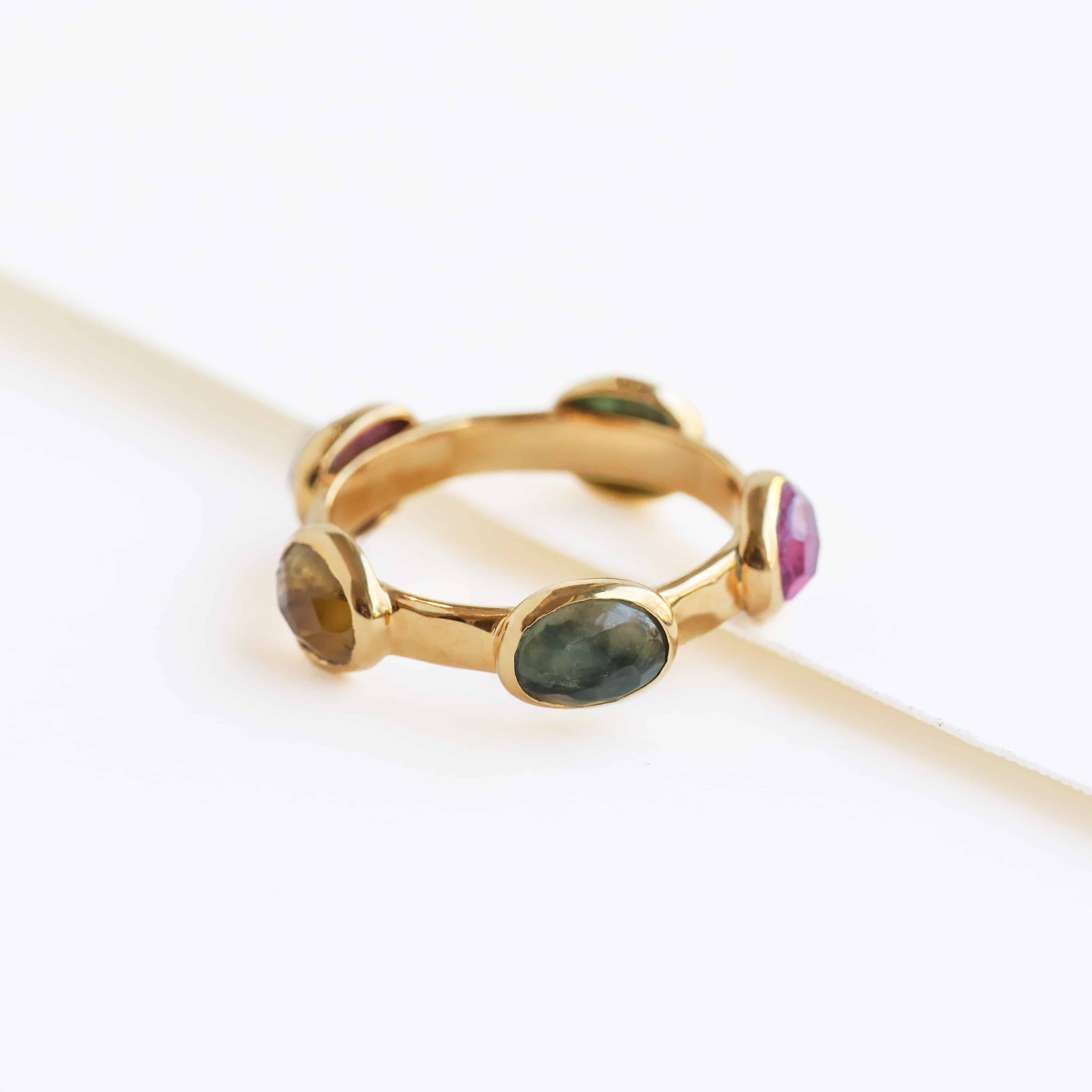 Bague sertie clos de tourmalines vertes, roses et jaunes brutes.