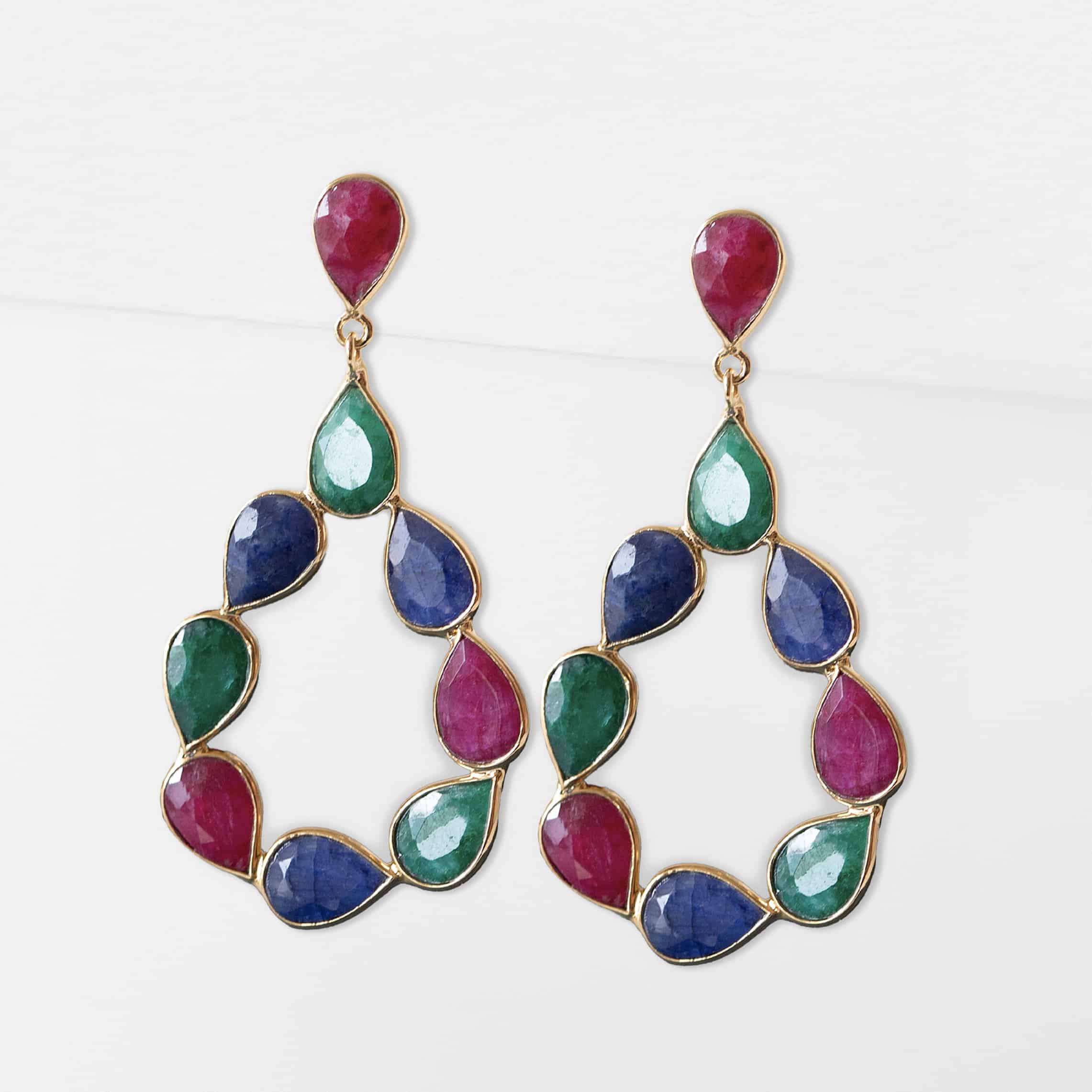 Boucles d'oreilles serties clos de rubis, saphirs et émeraudes brutes.