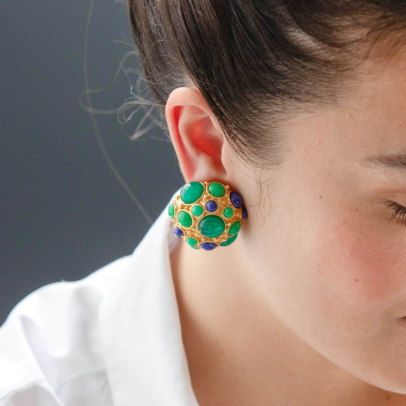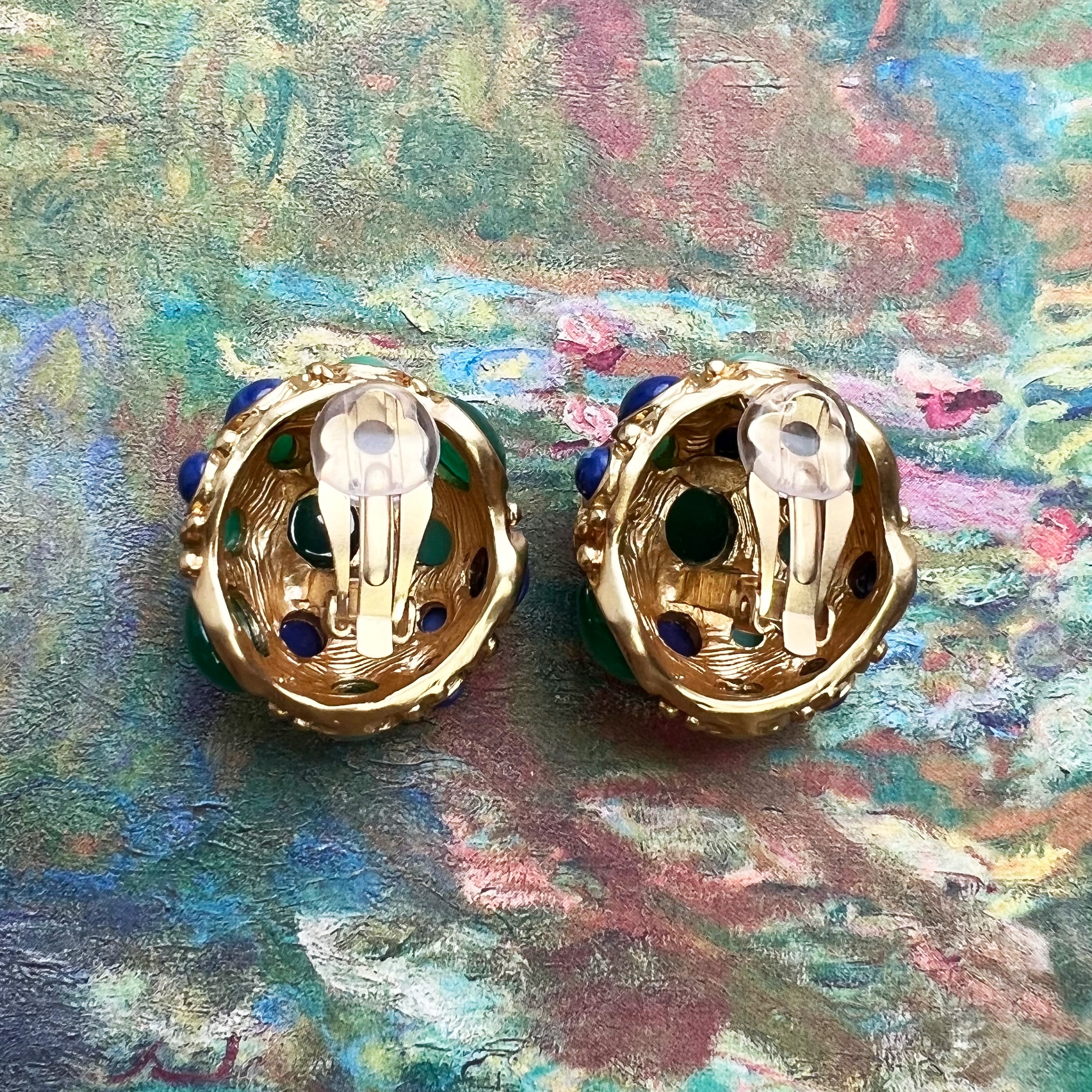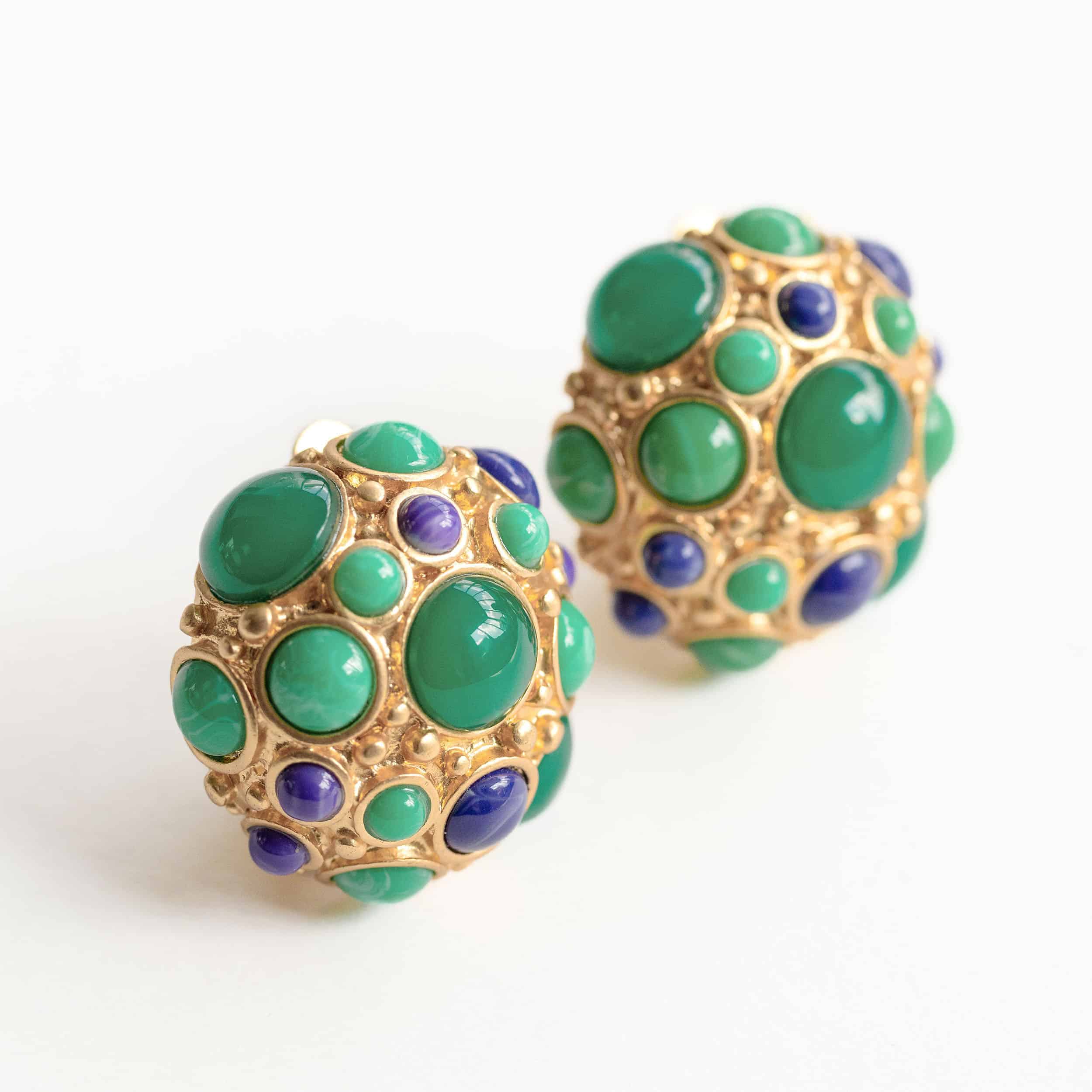 Boucles d'oreilles à clips, ciselées, serties de cabochons et dorés à l'or fin.