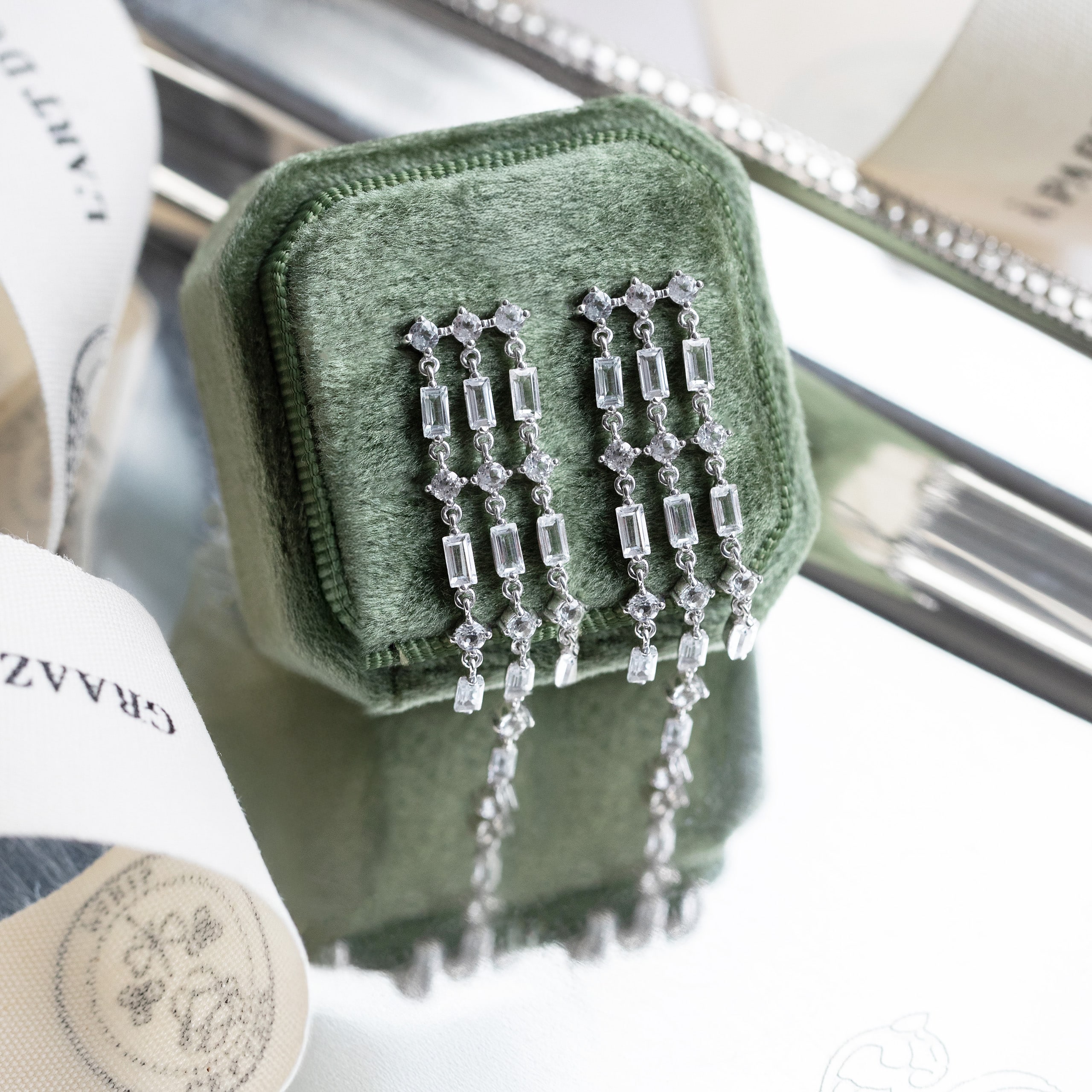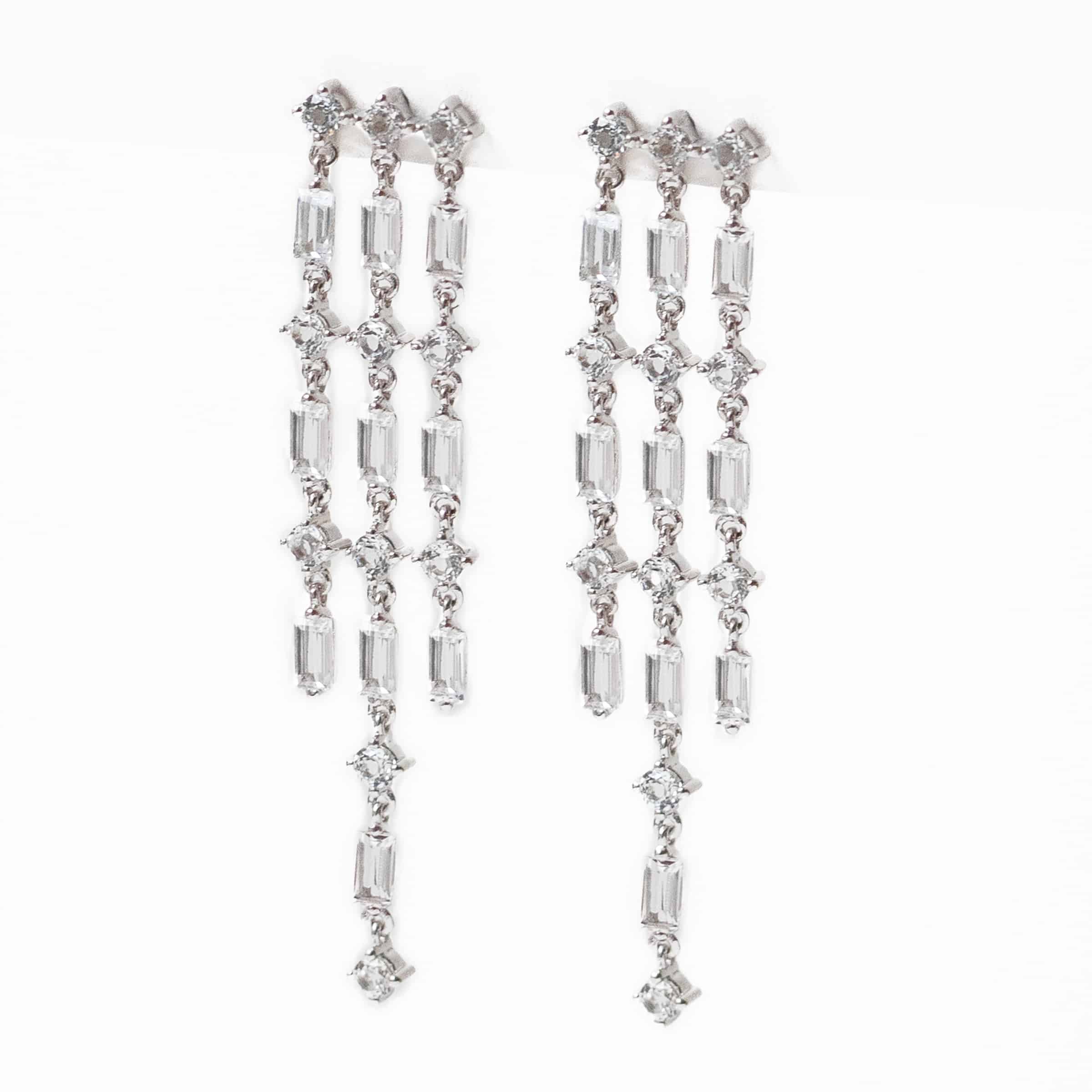 Boucles d'oreilles pendantes serties de topazes blanches véritables taille baguette et brillant. Ce bijou est en argent massif 925/1000e (métal précieux).