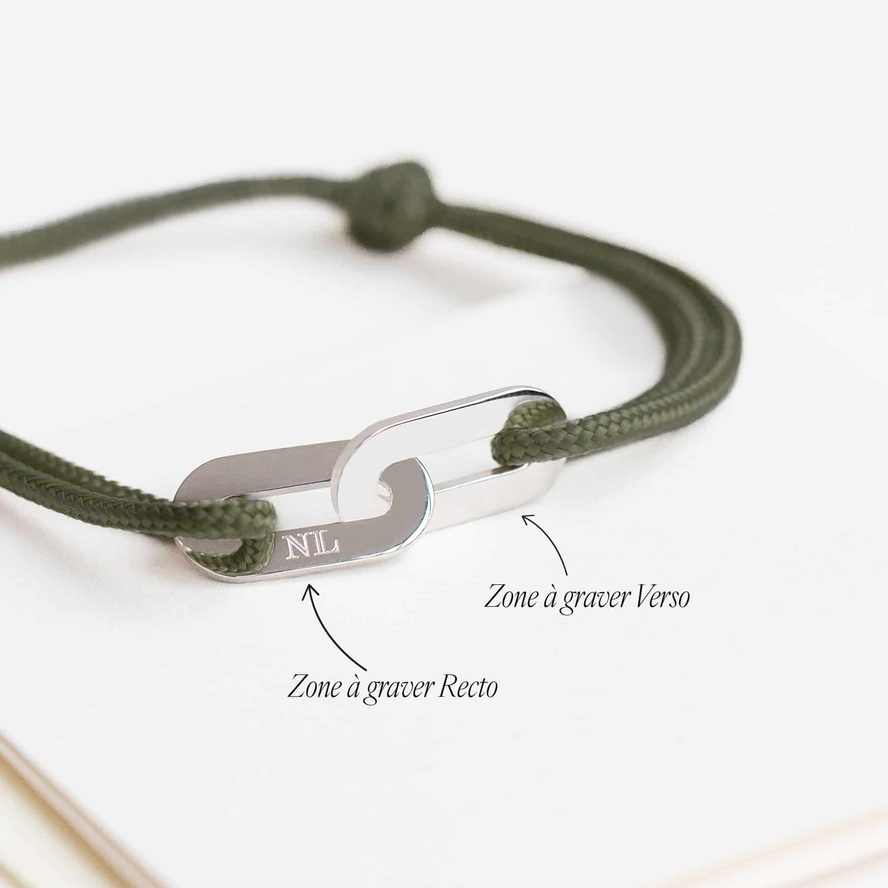 Bracelet anneaux entrelacés pour homme en argent 925 sur un lien kaki.