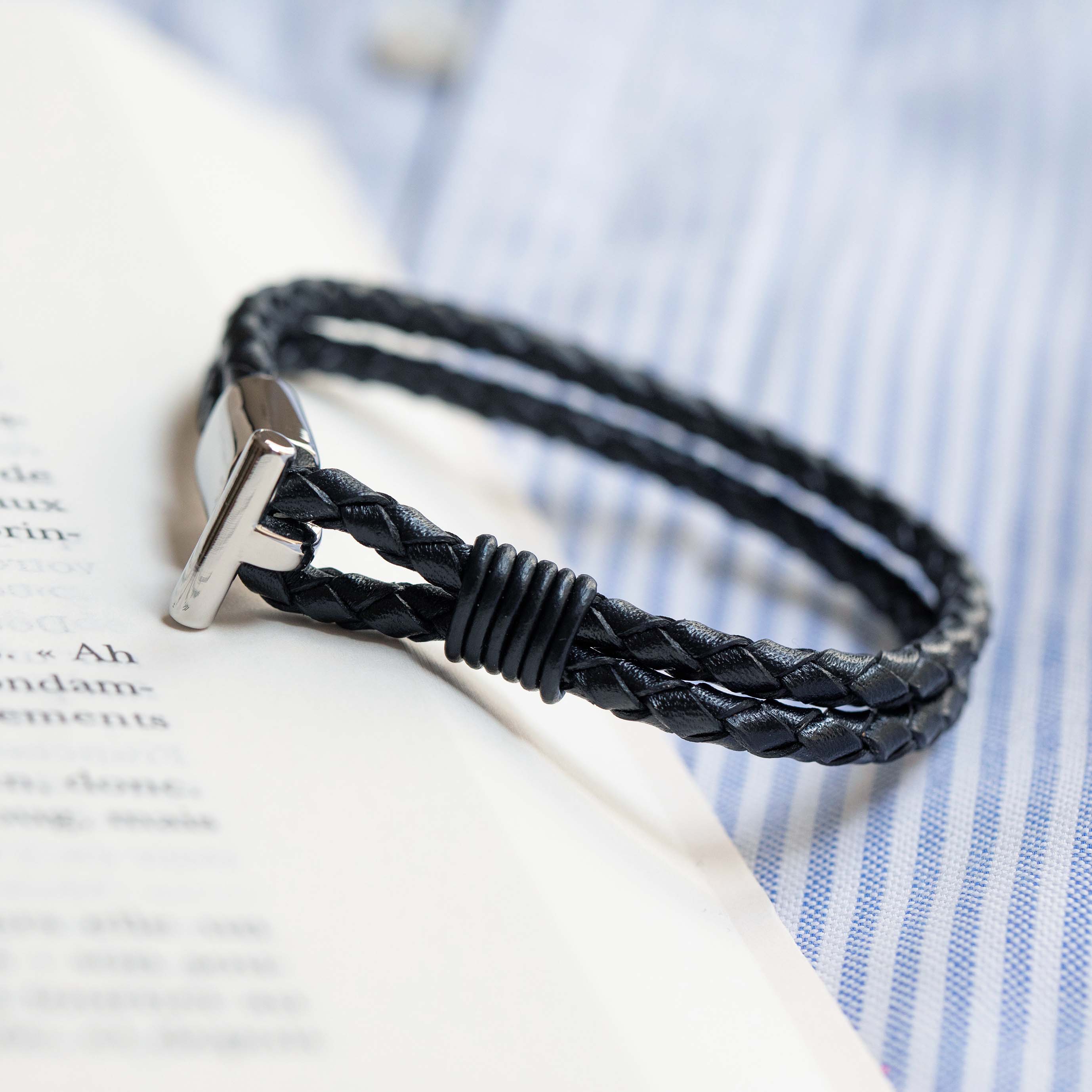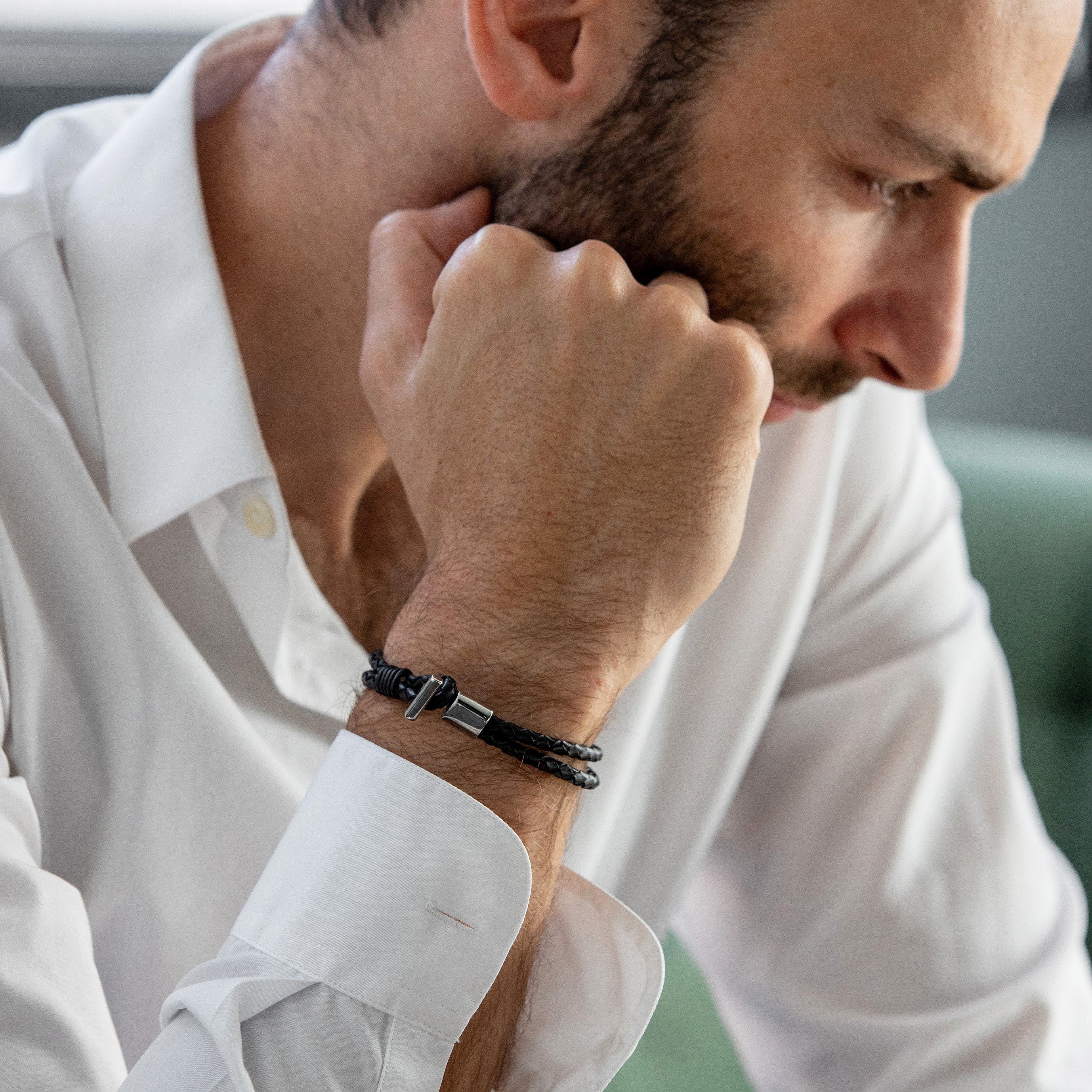 Bracelet pour homme double rang tressé noir en cuir véritable.