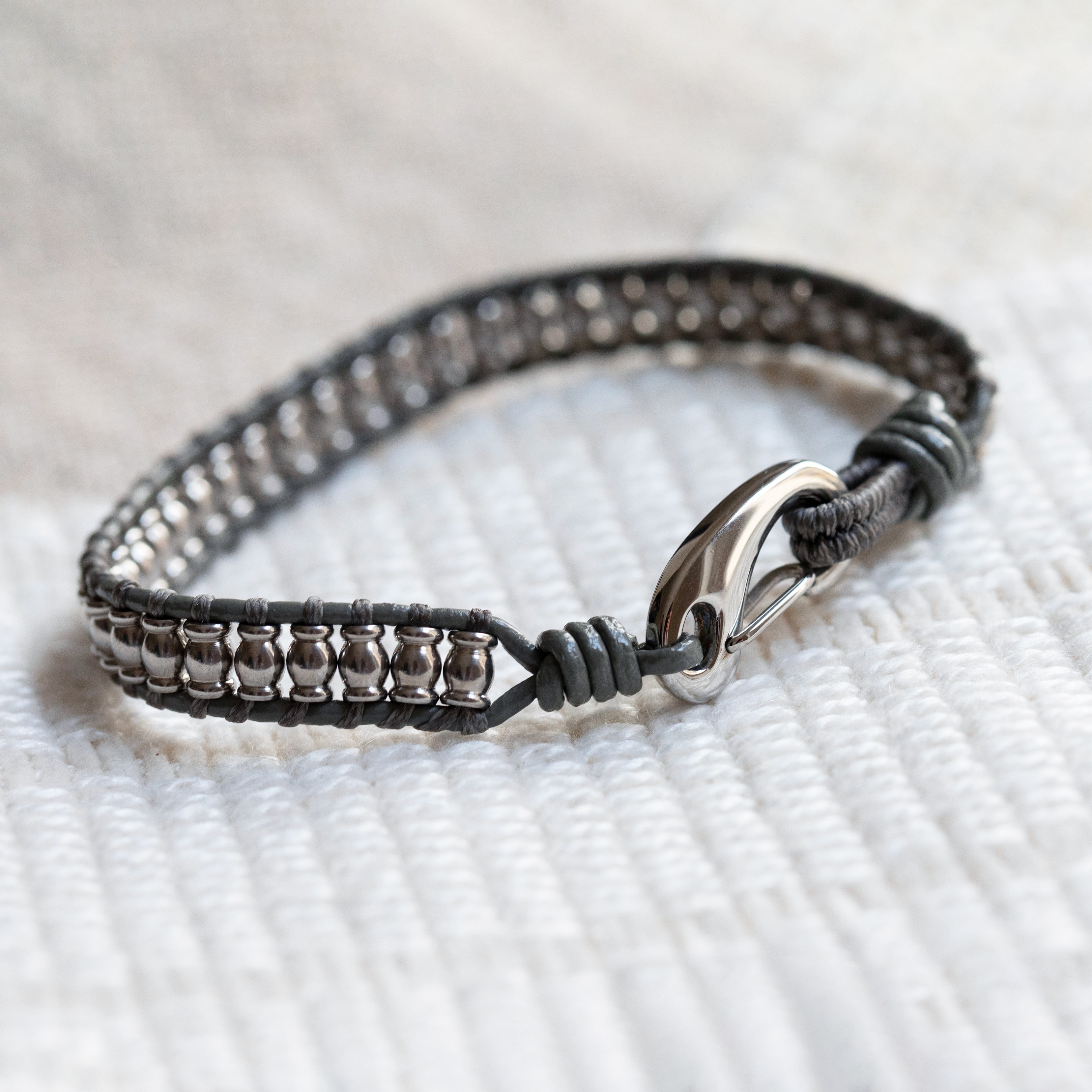 Bracelet pour homme gris en cuir véritable et acier inoxydable.