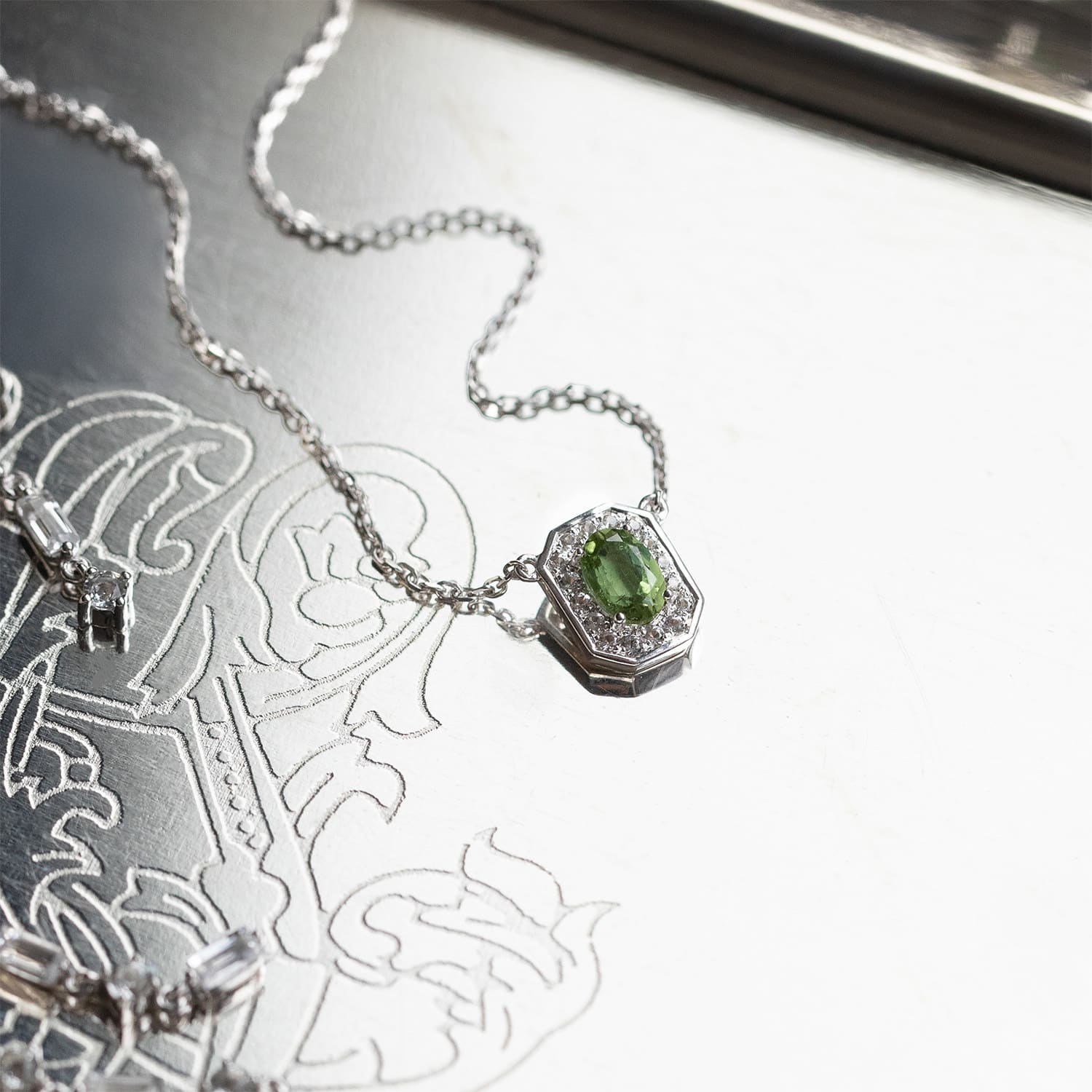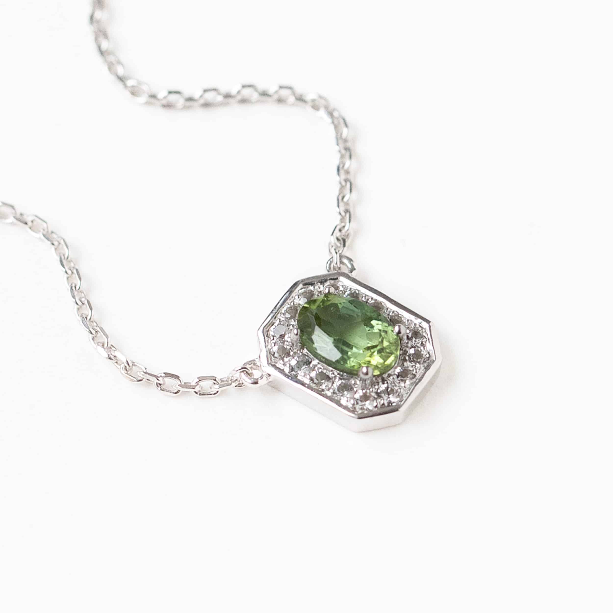 Collier serti d'une tourmaline verte véritable et naturelle taille ovale et de topazes blanches véritables taille brillant. Ce bijou est en argent massif 925/1000e (métal précieux).