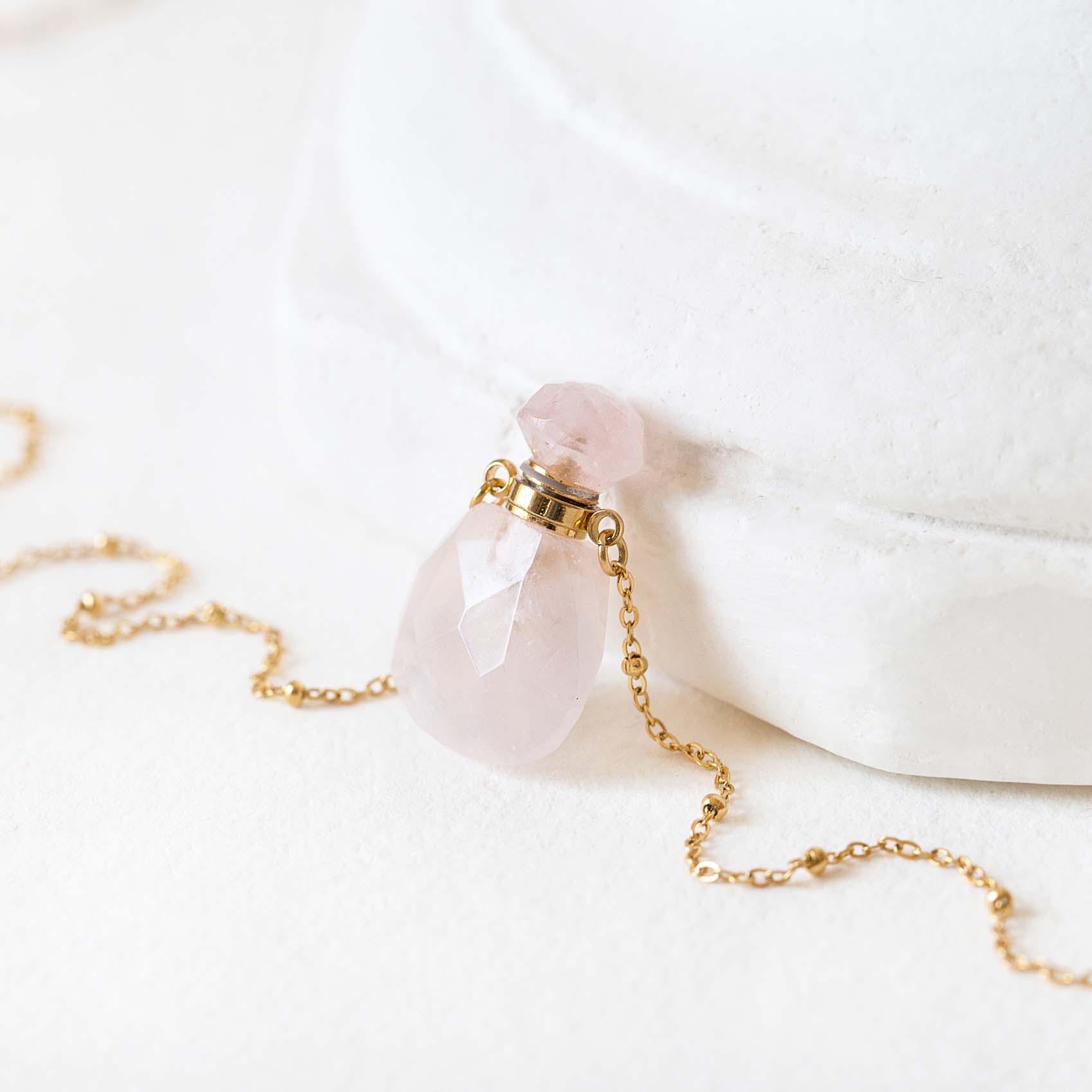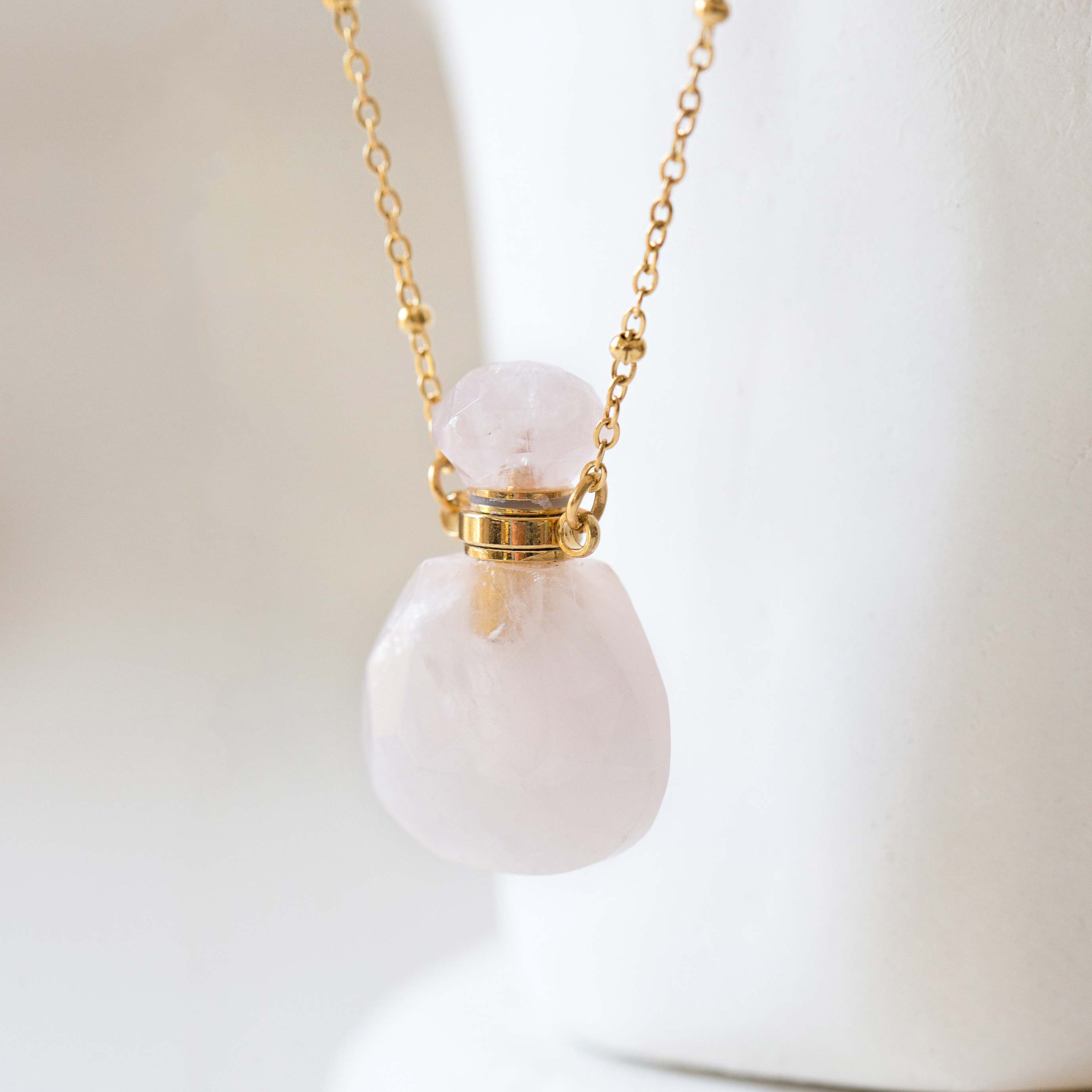 Collier sautoir avec une chaîne perlée et un pendentif fiole en quartz rose doré à l'or fin.