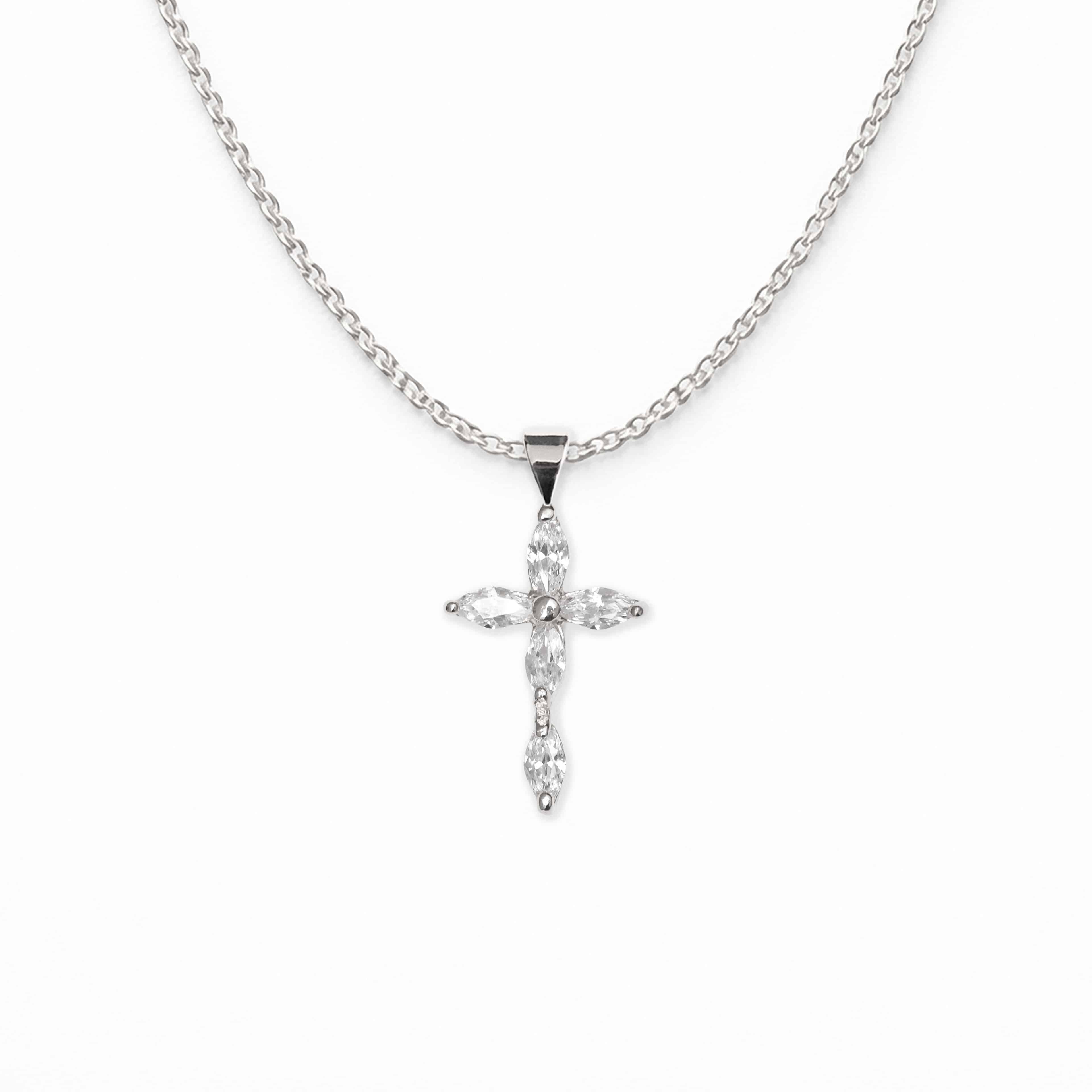 Collier pendentif croix, en argent 925/1000e (métal précieux). Serti de cristaux CZ* blancs taille marquise.