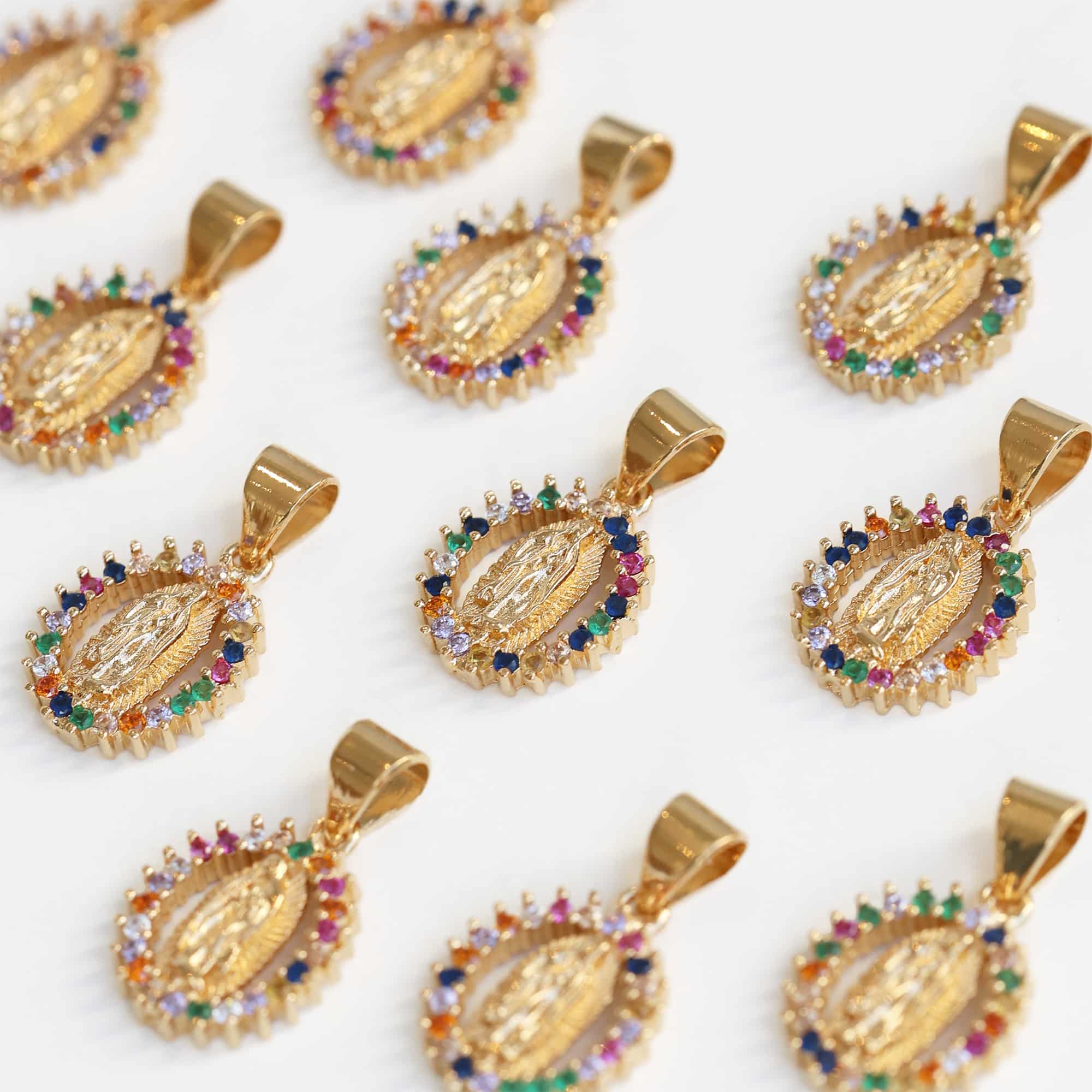Collier pendentif mini Vierge Marie pour enfant en plaqué or 18 carats, 3 microns. Serti de cristaux CZ* multicolores.