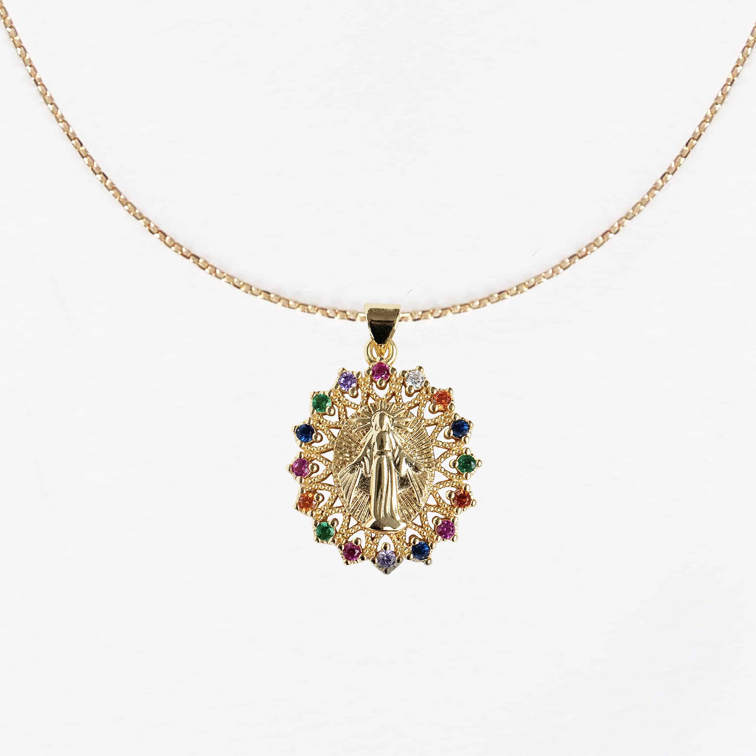 Collier médaillon Vierge Marie serti de cristaux CZ* multicolores.