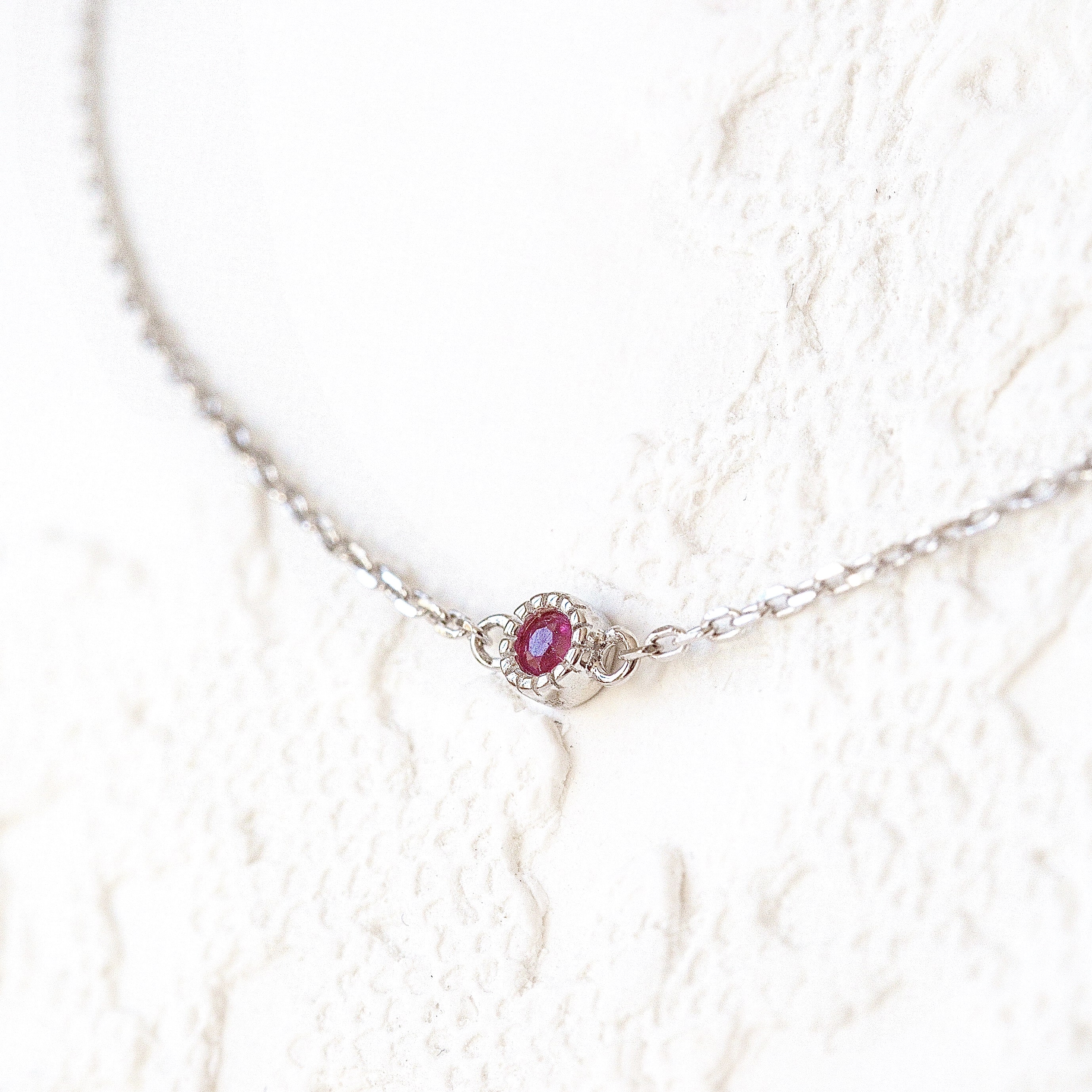 Collier en argent serti d’un rubis véritable et certifié, taille brillant, orné d’un décor perlé.