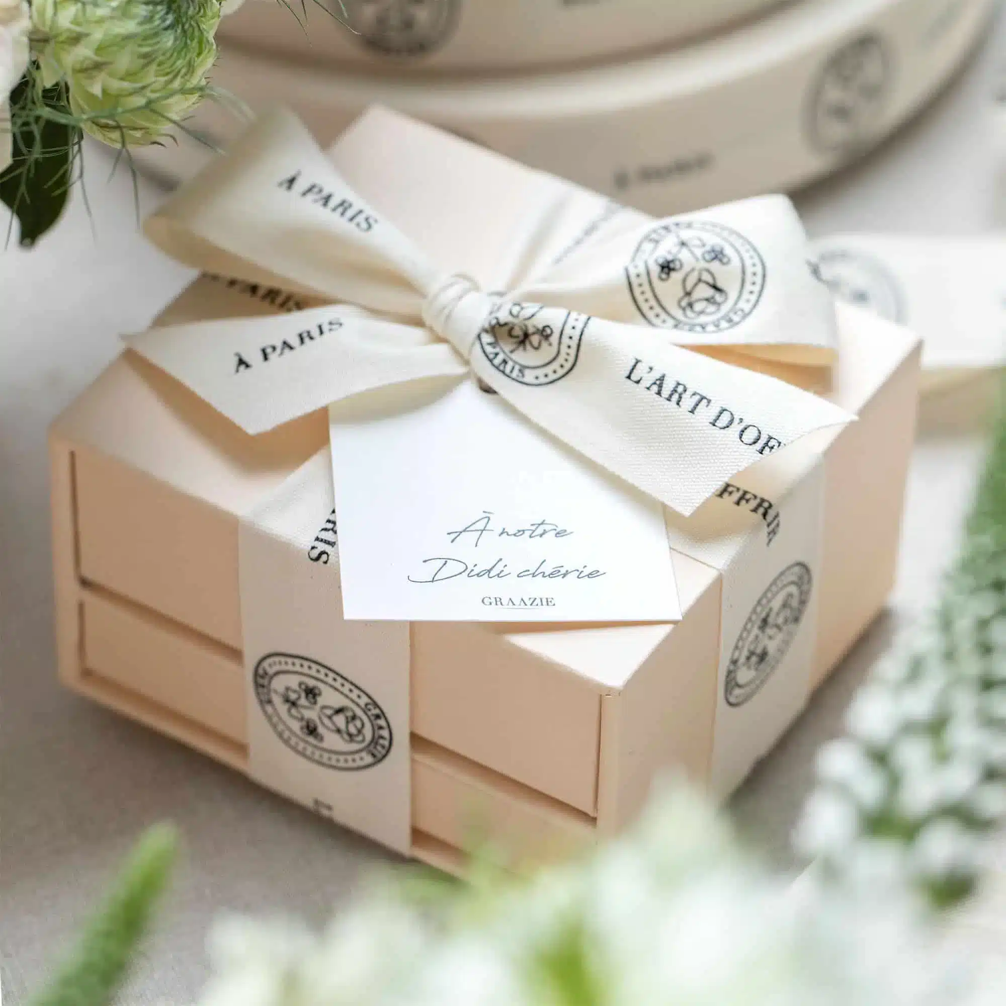 Ce coffret s'orne d'une étiquette personnalisée, nouée à un délicat ruban en sergé 100% coton.