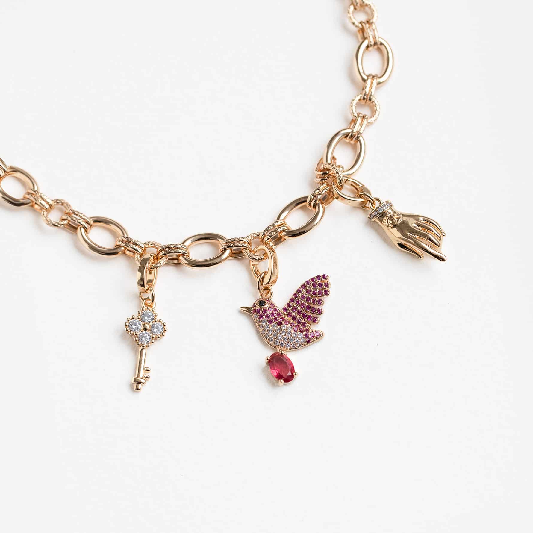 Le pendentif, les chaînes et le clip connecteur sont en plaqué or, 3 microns.