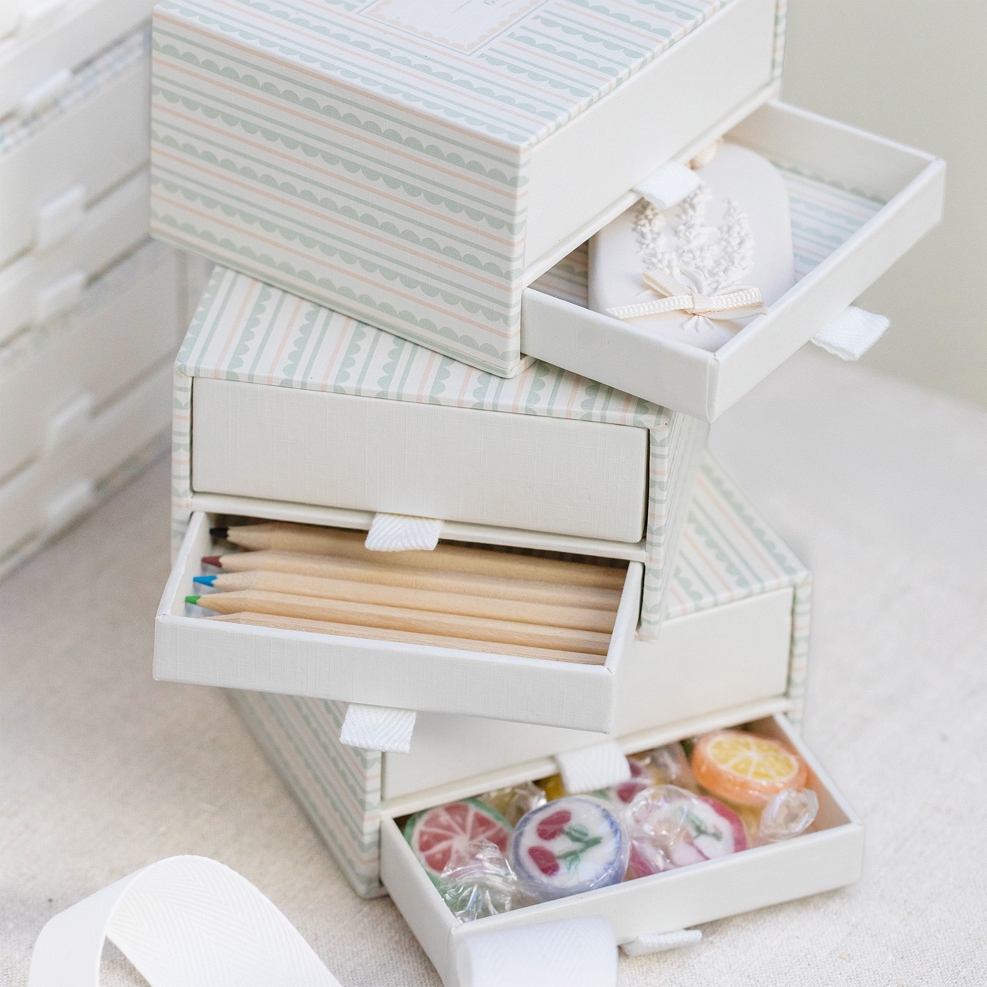 Ce coffret s'orne d'une étiquette personnalisée, nouée à un délicat ruban en sergé 100% coton.