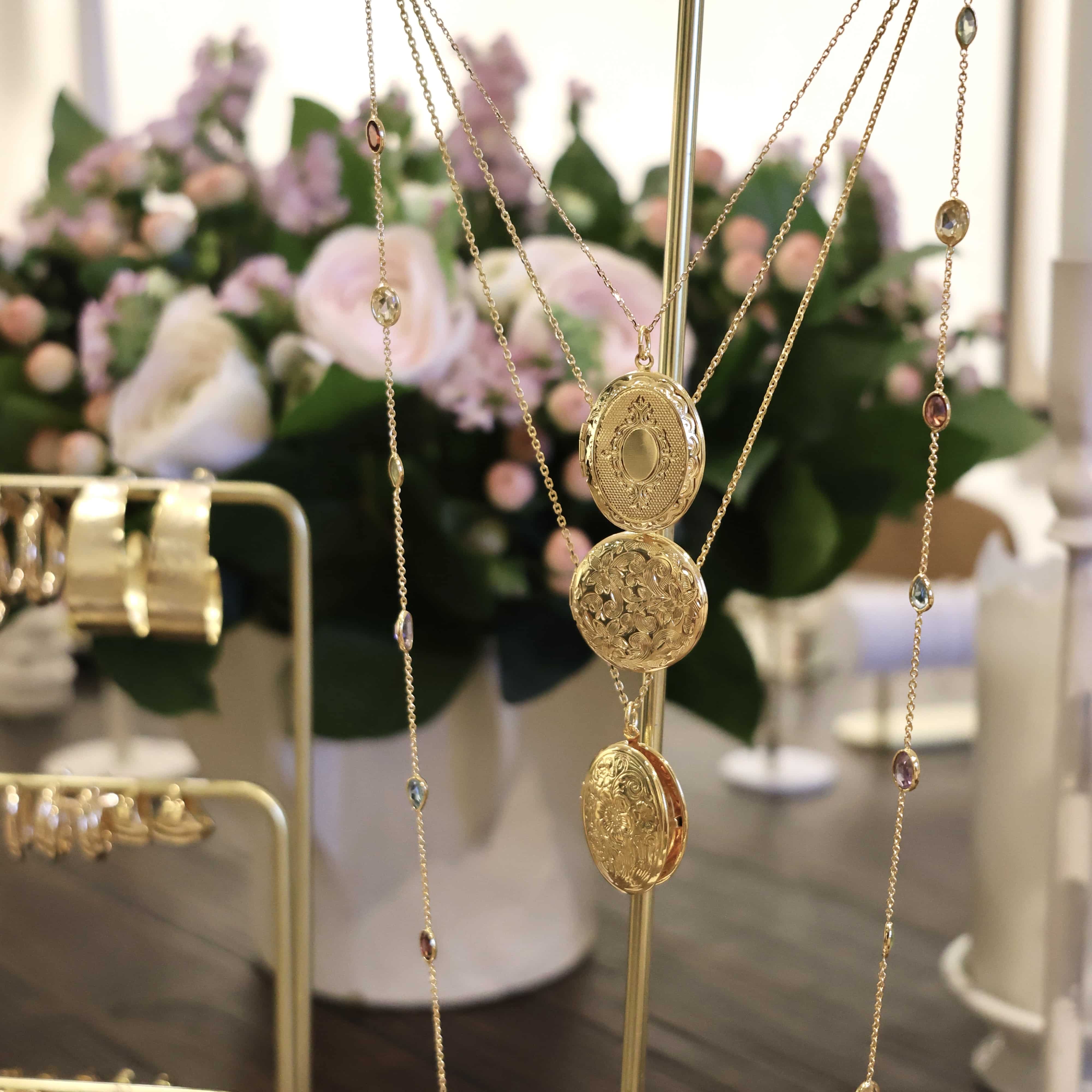 Collier médaillon ajustable orné d'un médaillon ovale, ciselé en plaqué or 18 carats, 1 micron.