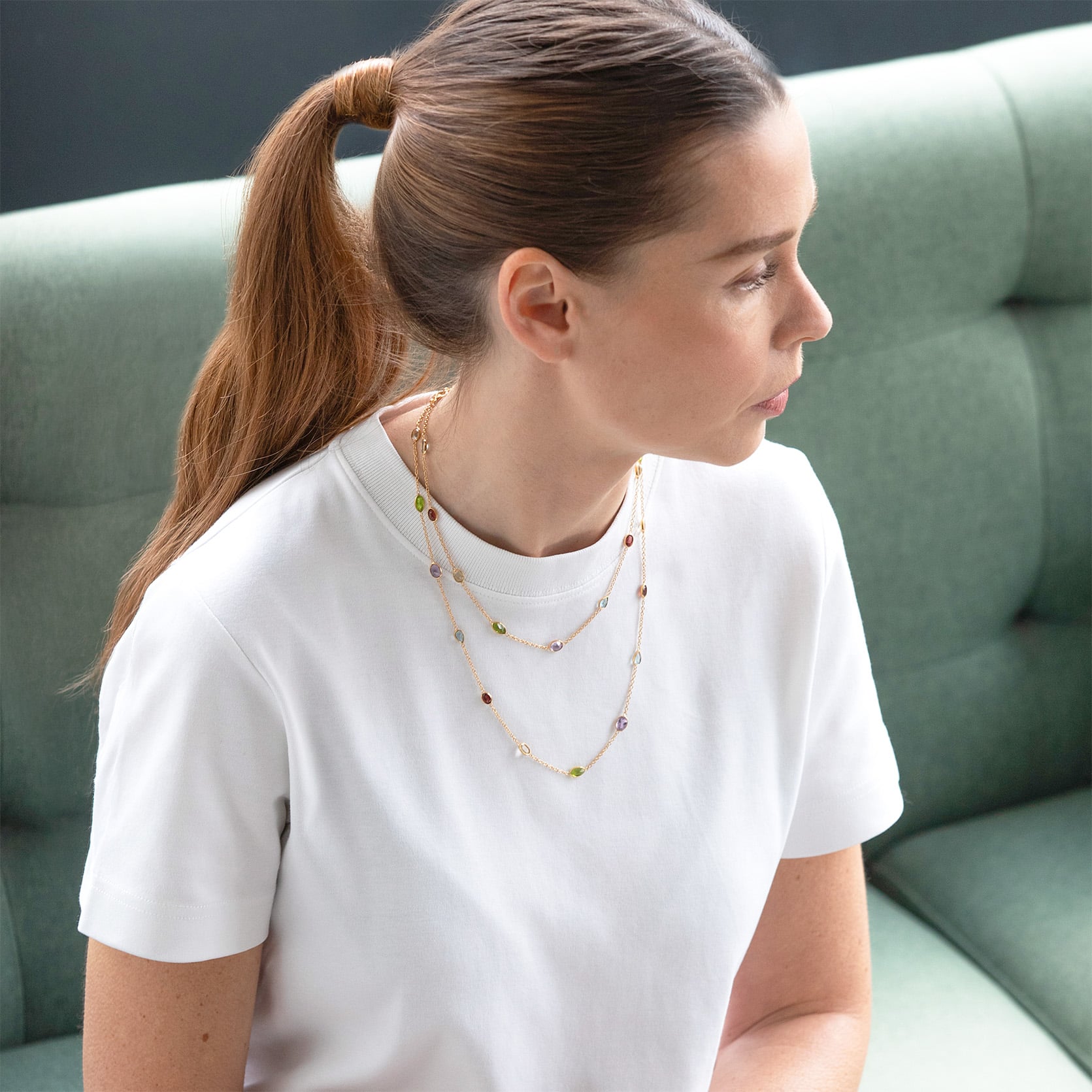 Collier sautoir serti clos de pierres semi-précieuses véritables : améthystes, topazes, citrines, grenats et péridots. Ce sautoir peut être porté en 2 rangs.